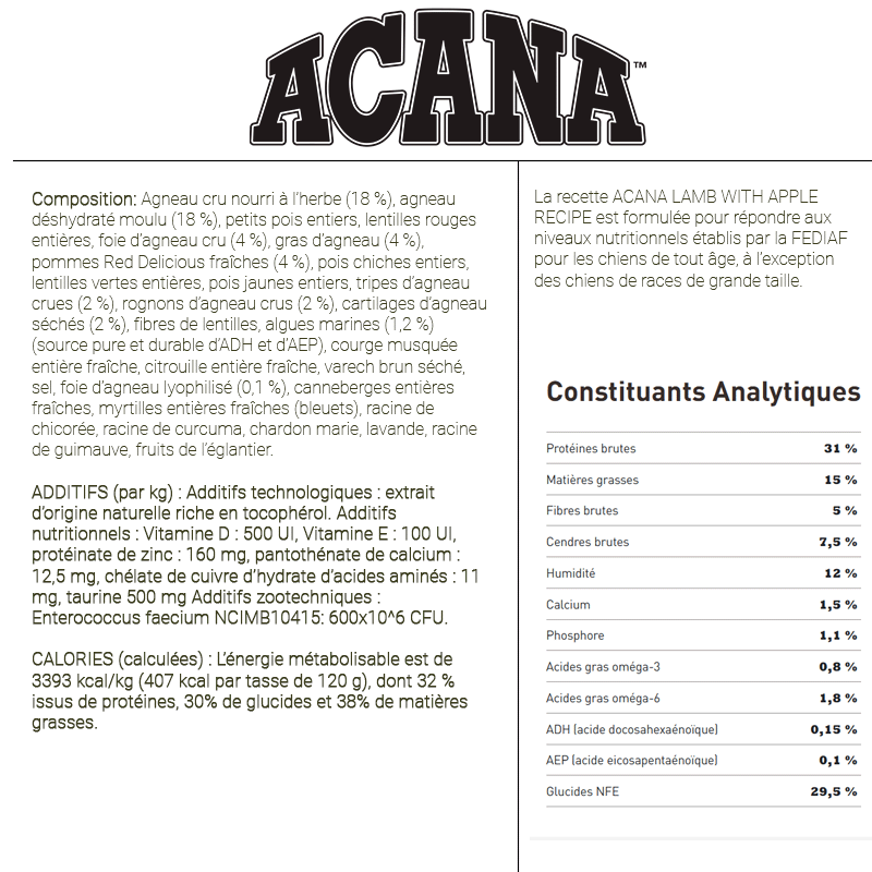 Ingrédients : Agneau cru (21 %), agneau déshydraté (19 %), pois verts entiers, lentilles rouges entières, foie d'agneau cru (8 %), huile de colza, pommes fraîches (4 %), pois chiches entiers, lentilles vertes entières, pois jaunes entiers, fibre de lentilles, amidon de pois, huile de tournesol, algues (source d'EPA et de DHA), tripes d'agneau crues (1 %), rein d'agneau cru (1 %), courge butternut entière fraîche, courge entière fraîche, algues kelp déshydratées, sel, racine de chicorée déshydratée, canneberges entières, myrtilles entières, curcuma, chardon de marie, racine de bardane, lavande, racine de guimauve, cynorrhodons.