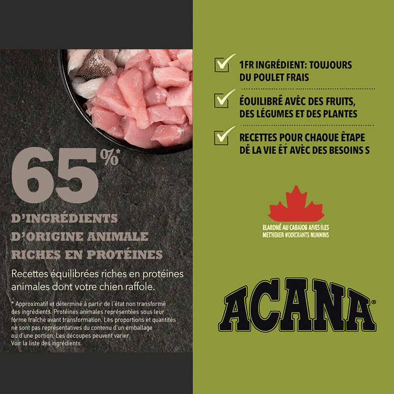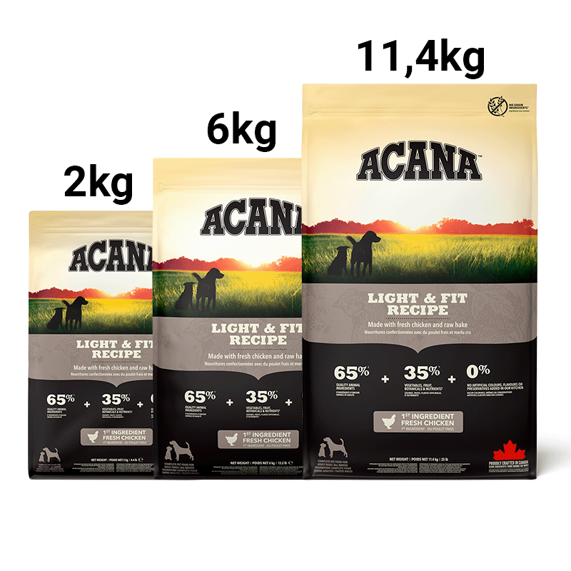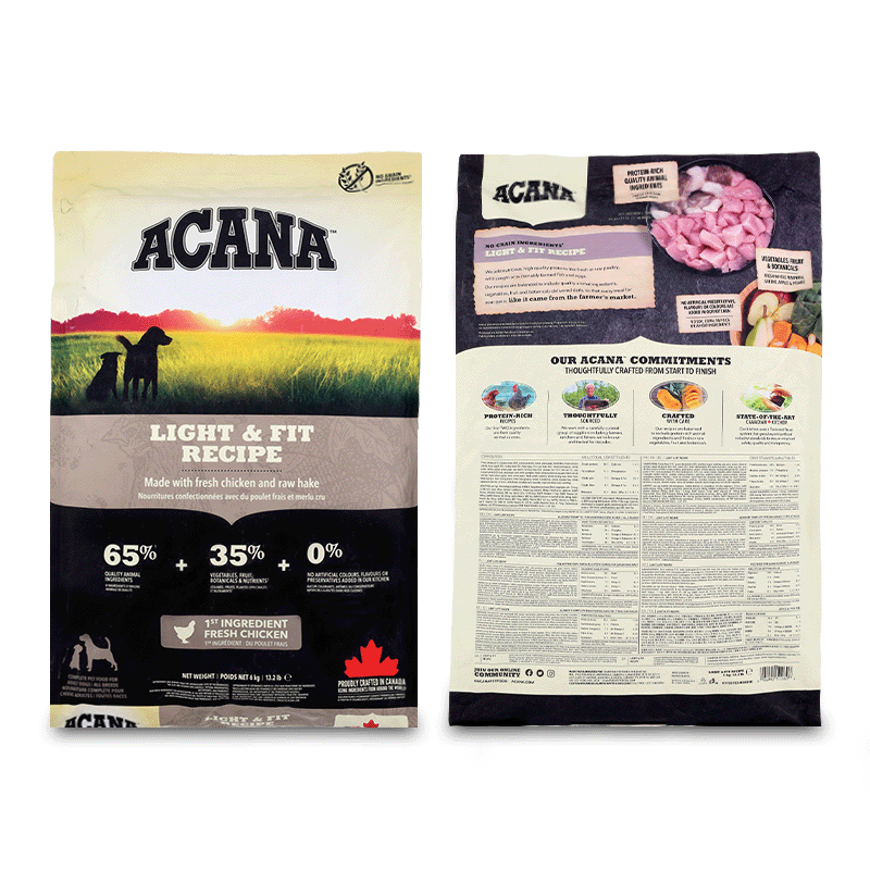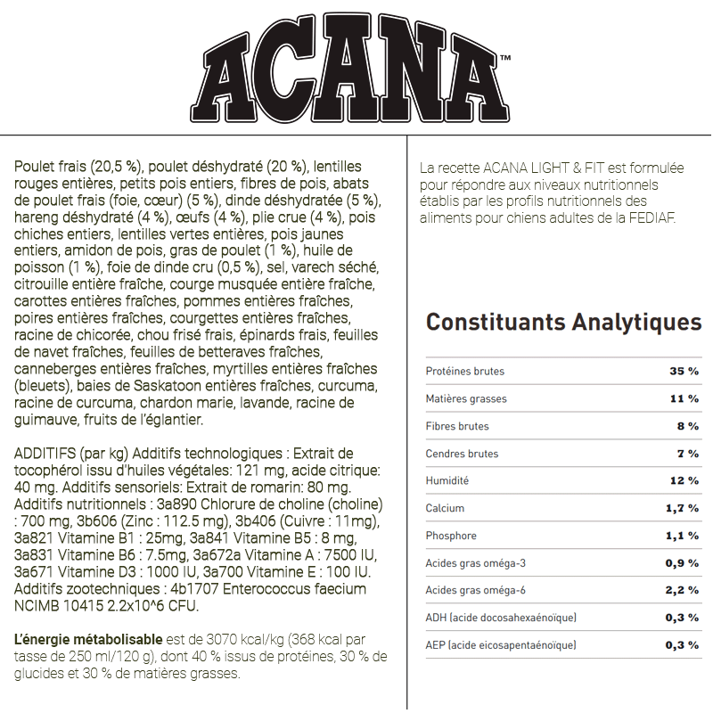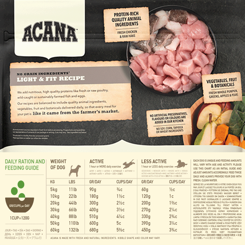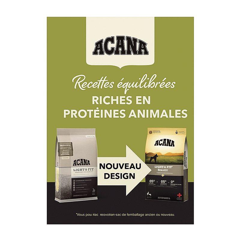Teneur élevée en protéines pour les chiens : La teneur en protéines de la nourriture Acana Light & Fit est adaptée aux besoins des espèces de chiens de taille moyenne ou grande, offrant une meilleure assimilation et d'excellents résultats pour la santé et le bien-être.