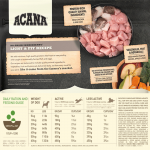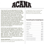 Ingrédients : Poulet frais (21 %), poulet déshydraté (20 %), lentilles rouges entières, pois verts entiers, fibre de lentilles, abats frais de poulet (foie, cœur) (5 %), dinde déshydratée (5 %), œufs frais (4 %), merlu cru (4 %), pois chiches entiers, lentilles vertes entières, pois jaunes entiers, amidon de pois, hareng déshydraté (3 %), graisse de poulet (1,5 %), huile de poisson (1 %), foie de dinde cru (0,5 %), sel, algues marines séchées, citrouille entière fraîche, citrouille butternut entière fraîche, carottes entières fraîches, pommes entières fraîches, poires entières fraîches, courgette entière fraîche, racine de chicorée séchée, chou frisé frais, épinards frais, feuilles de navet fraîches, feuilles de betterave fraîches, canneberges entières, myrtilles entières, baies de Saskatoon entières, curcuma, chardon, racine de bardane, lavande, racine de guimauve, cynorrhodons.