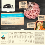 Ingrédients : Poulet frais (18 %), poulet déshydraté (18 %), lentilles rouges entières, pois verts entiers, abats frais de poulet (foie, cœur) (7 %), graisse de poulet (7 %), dinde déshydratée (4 %), œufs frais (4 %), merlu cru (4 %), hareng déshydraté (4 %), huile de poisson (3 %), lentilles vertes entières, pois chiches entiers, pois jaunes entiers, fibre de lentilles, amidon de pois, foie de dinde cru (1 %), sel, algues marines séchées, citrouille entière fraîche, citrouille butternut entière fraîche, carottes entières fraîches, pommes entières fraîches, poires entières fraîches, courgette entière fraîche, racine de chicorée séchée, chou frisé frais, épinards frais, feuilles de navet fraîches, feuilles de betterave fraîches, canneberges entières, myrtilles entières, baies de Saskatoon entières, curcuma, chardon, racine de bardane, lavande, racine de guimauve, cynorrhodons.