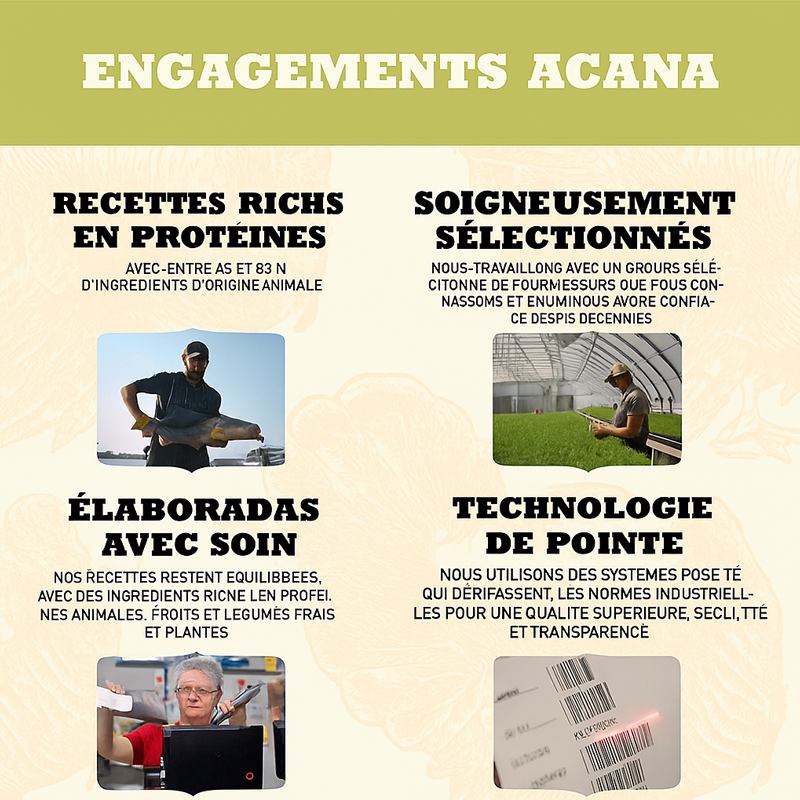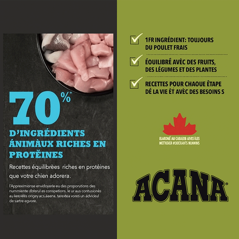 C'est un mélange d'ingrédients méditerranéens de première qualité avec du poulet de ferme, de la perdrix, de la truite et des œufs de rivière. Sa source de protéines est le poulet, provenant de fermes responsables et élevé selon les normes strictes de qualité d'Acana. La perdrix et la truite sont des viandes d'eau douce délicieuses, riches en protéines, en graisses saines et en acides gras oméga-3. Les champignons sauvages et les airelles offrent de la variété et un goût rafraîchissant. Les différents types de fruits et légumes contiennent des fibres pour une meilleure digestion et divers nutriments essentiels pour une santé optimale.