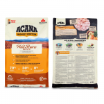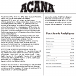 Ingrédients : Poulet frais (11 %), dinde crue (9 %), abats de poulet frais (foie, cœur) (9 %), poulet déshydraté (9 %), hareng déshydraté (9 %), pois verts entiers, lentilles rouges entières, pois chiches entiers, poisson cru de lac d'eau douce* (6 %), dinde déshydratée (6 %), œufs (4 %), graisse de poulet (4 %), lentilles vertes entières, haricots pinto entiers, pois jaunes entiers, fibre de lentilles, huile de poisson (2 %), amidon de pois, foie de dinde cru (1 %), algues marines séchées, sel, poulet et foie lyophilisés, citrouille entière fraîche, citrouille butternut entière fraîche, carottes entières fraîches, pommes entières fraîches, poires entières fraîches, courgette entière fraîche, racine de chicorée séchée, chou frisé frais, épinards frais, feuilles de navet fraîches, feuilles de betterave fraîches, canneberges entières, myrtilles entières, baies de Saskatoon entières, curcuma, chardon, racine de bardane, lavande, racine de guimauve, cynorrhodons.