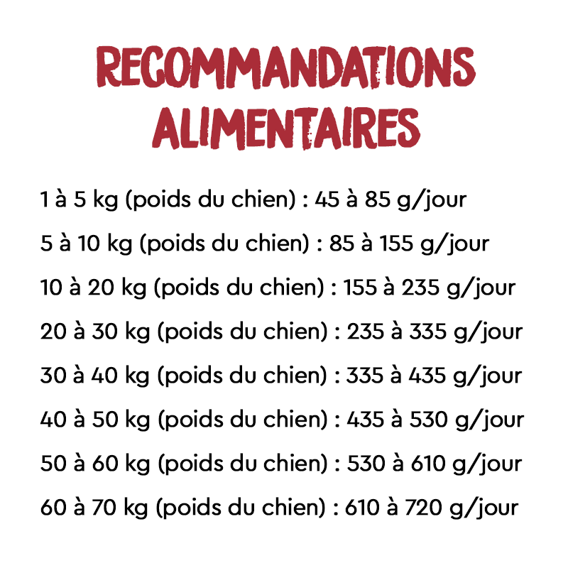 60-70 kg (poids du chien) ; 610-720 g/jour