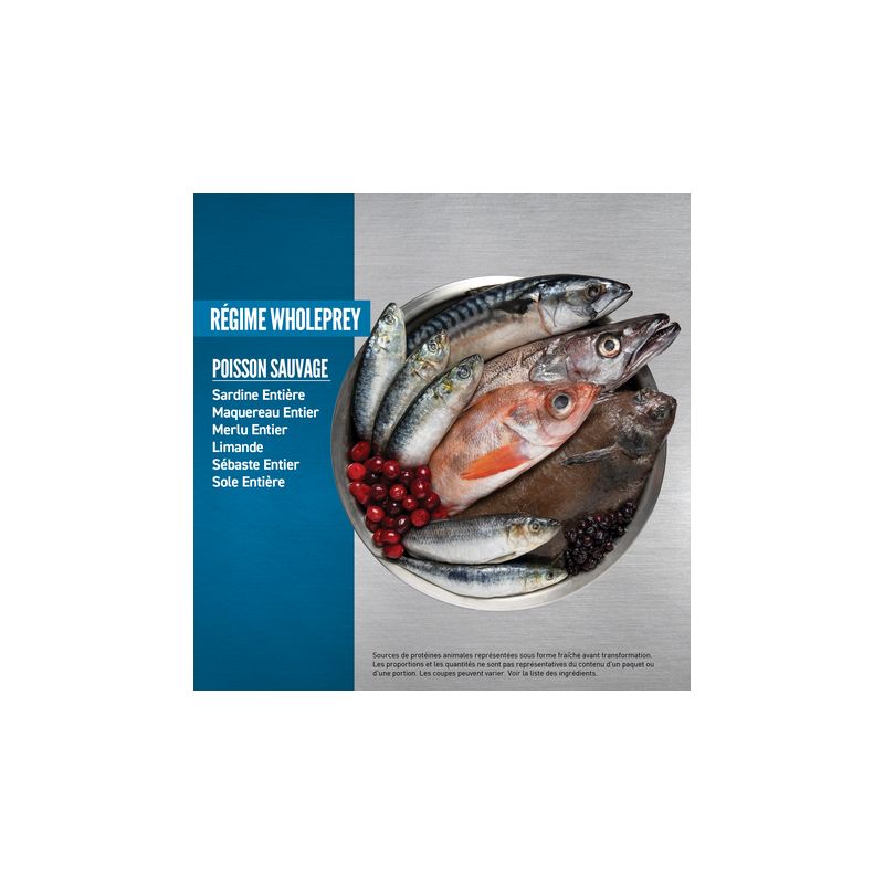 Poulet frais (18 %), dinde crue (10 %), abats de poulet frais (foie, cœur) (10 %), hareng entier cru (6 %), merlu entier cru (5 %), œufs frais (5 %), foie de dinde cru (5 %), poulet déshydraté (5 %), dinde déshydratée (5 %), maquereau déshydraté (4 %), sardine déshydratée (4 %), hareng déshydraté (4 %), lentilles rouges entières, pois chiches entiers, pois entiers, fibre de lentilles, pois entiers, haricots pintos entiers, amidon de pois, huile de goberge (2 %), graisse de poulet (2 %), haricots blancs entiers, varech déshydraté, courge entière fraîche, courge butternut entière fraîche, courgettes entières fraîches, carottes entières fraîches, pommes fraîches entières, poires fraîches entières, racine de chicorée déshydratée, chou frisé frais, épinards frais, feuilles de betterave fraîches, feuilles de moutarde fraîches, canneberges entières, myrtilles entières, baies de saskatoon entières, curcuma, chardon-Marie, racine de bardane, lavande, racine de guimauve, cynorrhodon.