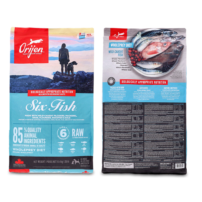 Cette nourriture pour chiens, ORIJEN™ Six Fish™, est chargée de protéines de qualité maximisant la nutrition.