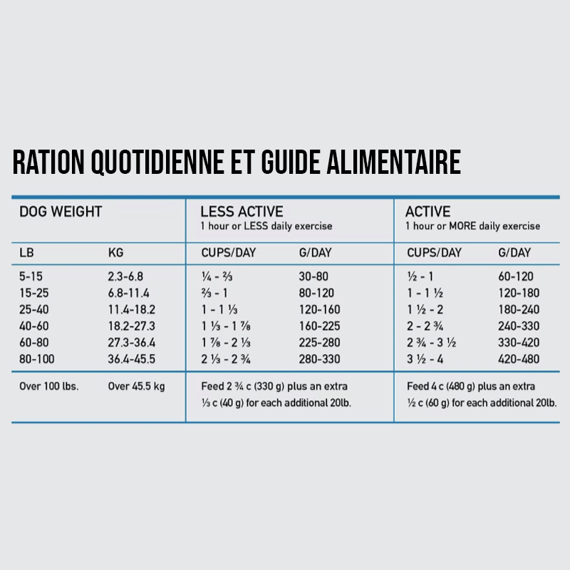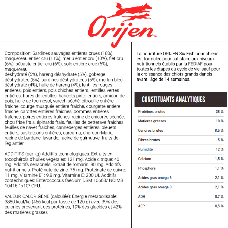 L'énergie métabolisable est de 3710 kcal/kg (445 kcal par tasse de 250 ml/120 g), avec des calories bien réparties pour maintenir des conditions optimales, dont 41 % proviennent des protéines, 23 % des glucides et 36 % des matières grasses. | ORIJEN™ Senior Dog est formulé pour répondre aux recommandations nutritionnelles établies par la FEDIAF pour les aliments pour chiens adultes en entretien. Conservez dans un endroit frais et sec. Non destiné à la consommation humaine.