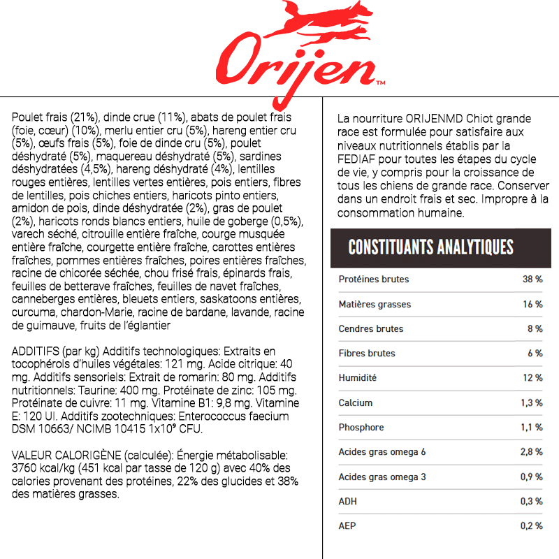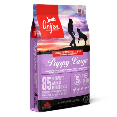 Orijen Puppy Large: Nourriture pour chiots de grandes races, sans céréales, favorisant leur croissance optimale.