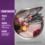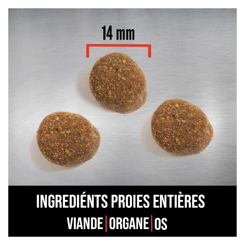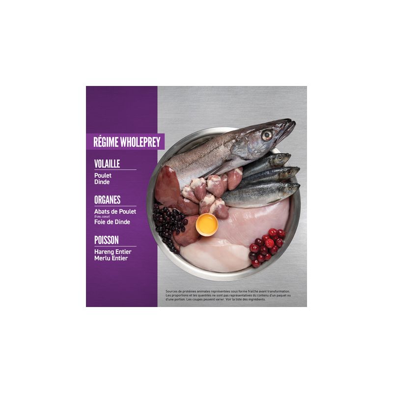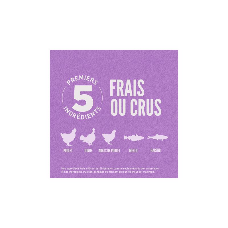 Composition : Viande fraîche de poulet (14%), viande fraîche de dinde (7%), œufs entiers frais (7%), foie frais de poulet (6%), sole entière fraîche (5%), hareng entier frais (5%), foie frais de dinde (5%), cou frais de poulet (4%), cœur frais de poulet (4%), cœur frais de dinde (4%), poulet (déshydraté, 4%), dinde (déshydratée, 4%), maquereau entier (déshydraté, 4%), sardine entière (déshydratée, 4%), hareng entier (déshydraté, 4%), lentilles rouges, lentilles vertes, pois verts, fibres de lentilles, pois chiches, pois jaunes, haricots d'Espagne, haricots blancs, huile de hareng (1%), cartilage de poulet (1%), graisse de poulet (1%), luzerne, foie de poulet (lyophilisé), foie de dinde (lyophilisé), citrouille fraîche, courge butternut fraîche, courgette fraîche, courgette fraîche, panais frais, carottes fraîches, pommes fraîches, poires fraîches, chou frais, épinards frais, feuilles de betteraves fraîches, feuilles de navet fraîches, varech brun, airelles rouges entières, myrtilles entières, baies d'amélanchier entières, racine de chicorée, curcuma, chardon-marie, racine de bardane, lavande, racine de guimauve, cynorrhodon.