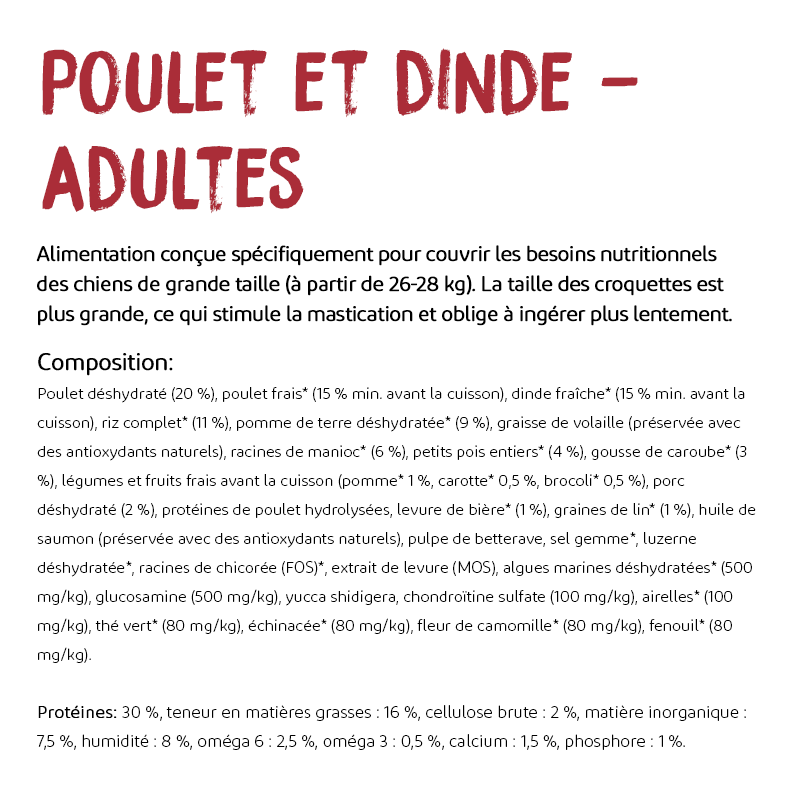 Poulet déshydraté (18 %), poulet frais* (au moins 15 % avant cuisson), dinde fraîche* (au moins 15 % avant cuisson), racines de manioc* (8 %), pois entiers* (7 %), riz complet* (7 %), graisse de poulet (conservée avec des antioxydants naturels), fèves entières* (4 %), orge complet* (4 %), patate douce déshydratée* (4 %), protéine de poulet hydrolysée (2,5 %), légumes et fruits frais avant cuisson (pomme* 1 %, carotte* 0,5 %, brocoli* 0,5 %), porc déshydraté (2 %), levure de bière* (1 %), pulpe de betterave, cosse de caroube* (1 %), huile de saumon (conservée avec des antioxydants naturels), graines de lin* (1 %), sel gemme*, luzerne déshydratée*, racines de chicorée (FOS)*, extrait de levures (MOS), algues marines déshydratées* (500 mg/kg), glucosamine (500 mg/kg), yucca schidigera, sulfate de chondroïtine (100 mg/kg), canneberges* (100 mg/kg), thé vert* (100 mg/kg), échinacée* (100 mg/kg), camomille* (100 mg/kg). *INGRÉDIENTS NATURELS