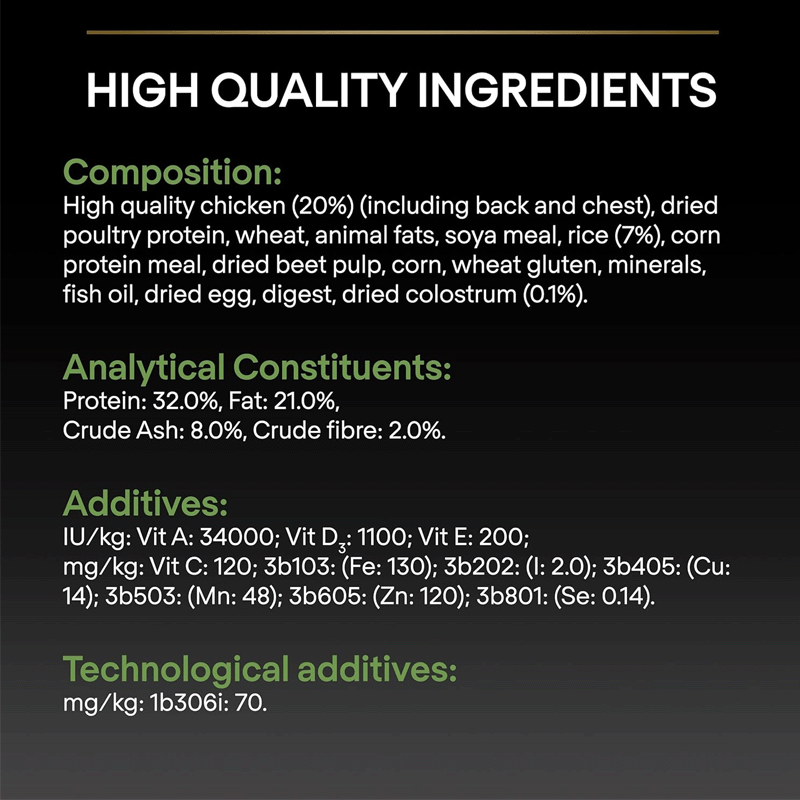 Croissance saine et maintien à long terme : La teneur adaptée en une combinaison de protéines et de graisses favorise une croissance saine et un maintien à long terme. Cela garantit que vos chiots obtiennent l'énergie et les nutriments nécessaires pour grandir forts et rester en bonne santé pendant leur période de croissance et au-delà.