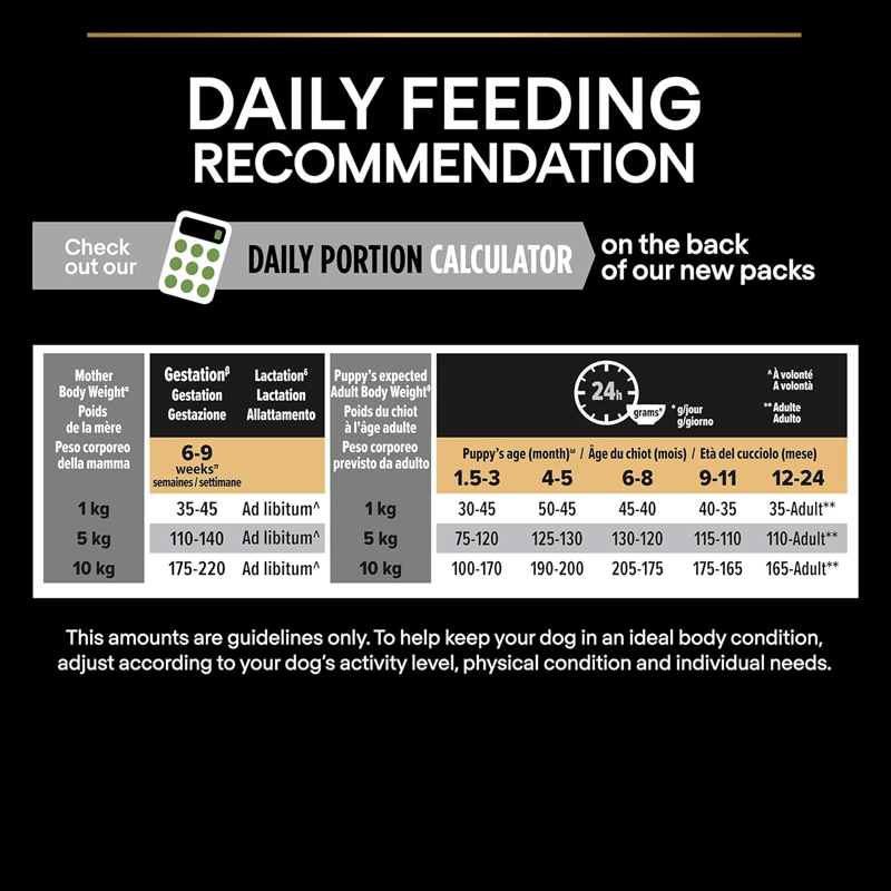 Sevrage : de 4 à 8 semaines, offrez PRO PLAN® Puppy humidifié 3 à 4 fois par jour, en réduisant progressivement la quantité de liquide ajouté.