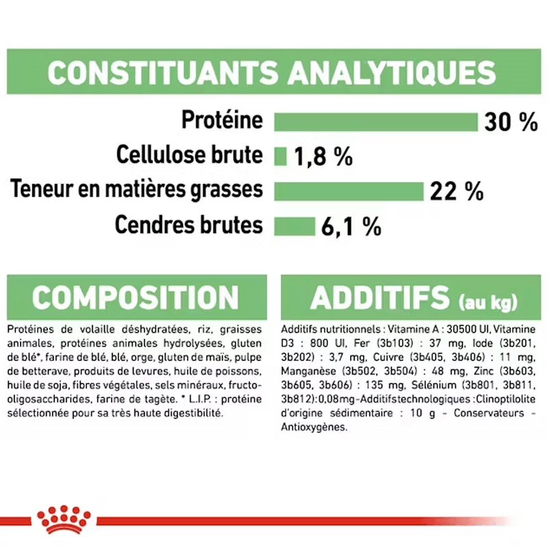 De plus, les prébiotiques favorisent une flore intestinale saine. ROYAL CANIN® accorde une grande importance à la qualité des protéines, c'est pourquoi cette recette contient des protéines hautement digestibles, connues sous le nom de L.I.P., pour une meilleure absorption des nutriments et le bien-être intestinal de votre animal.