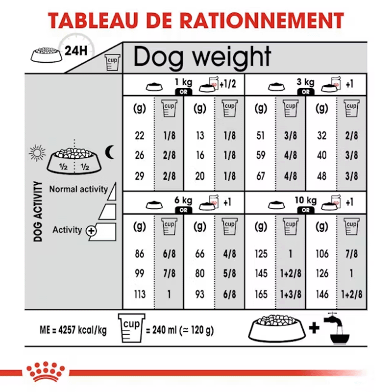 | 10 kg | 125 g (1 verre) | 145 g (1+2/8 verre) | 165 g (1+3/8 verre) |