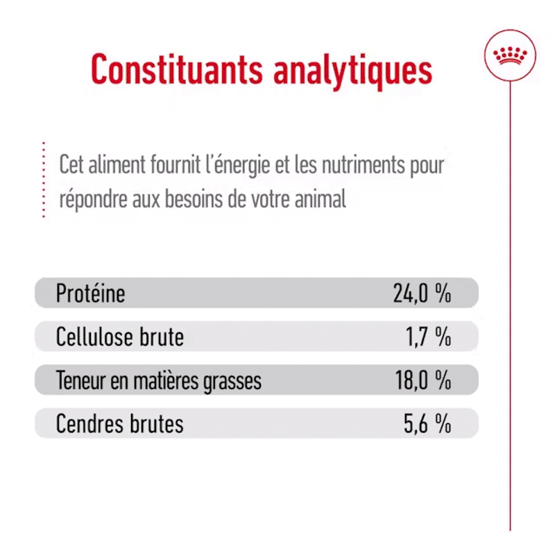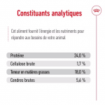 Constituants analytiques : Protéine brute : 24,0% - Matières grasses brutes : 18,0% - Cendres brutes : 5,4% - Fibres brutes : 1,7%.