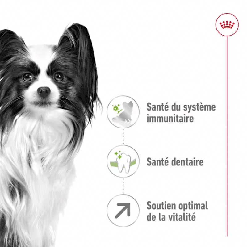 X-Small Ageing 12+ de ROYAL CANIN® est une alimentation conçue pour les très petits chiens de plus de 12 ans, pesant jusqu'à 4 kg maximum, qui se concentre sur leurs besoins nutritionnels spécifiques liés au vieillissement. Cette alimentation a été développée pour favoriser un vieillissement en bonne santé chez les chiens de très petite taille comme le vôtre, en mettant l'accent sur le maintien du bien-être général.