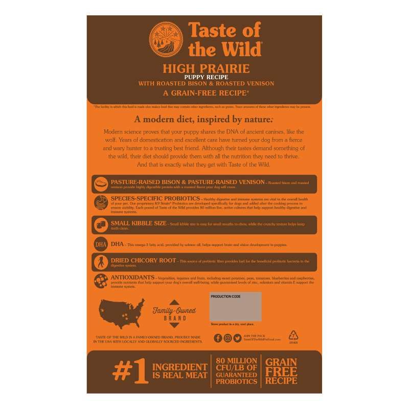 Taste of The Wild High Prairie Puppy est une formule sans céréales, idéale pour les chiots en croissance.