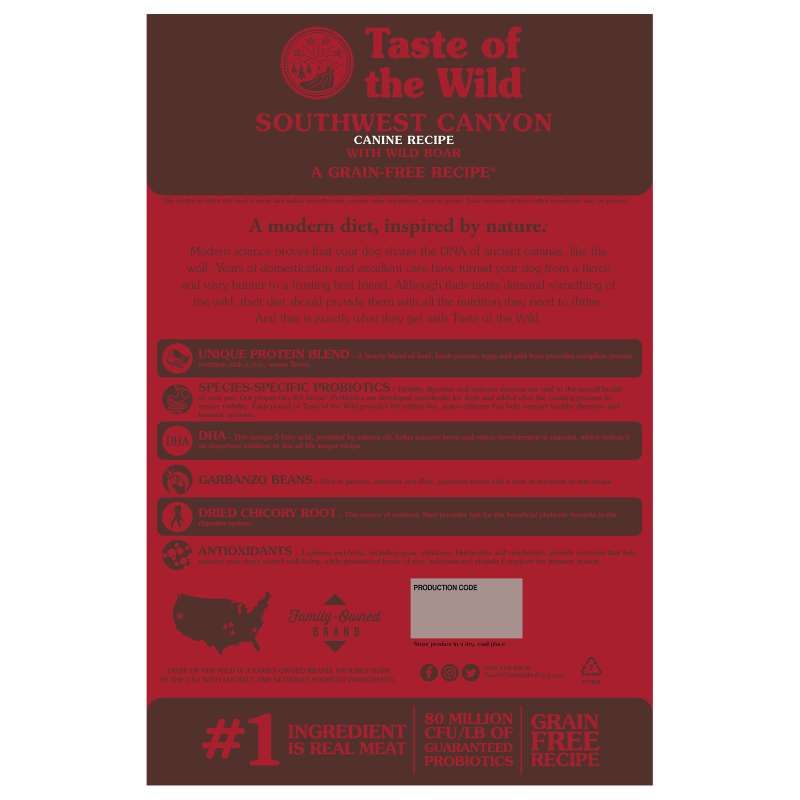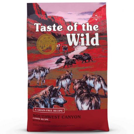 Taste of the Wild Southwest Canyon est le choix parfait pour les chiens de toutes les races, tailles et âges, offrant une alimentation équilibrée et saine sans céréales ni gluten. Les protéines issues de viande de bœuf, de sanglier, d'agneau et d'œufs contribuent au maintien d'une musculature forte et en pleine forme.