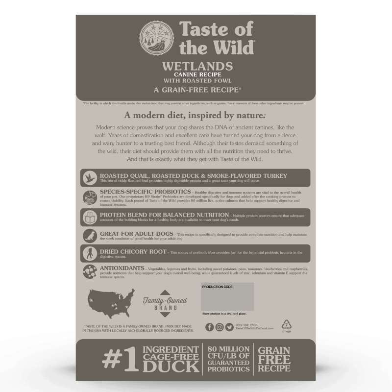 Taste of the Wild Wetlands est élaboré avec des ingrédients soigneusement sélectionnés, sans colorants ni conservateurs artificiels, pour que votre chien puisse profiter d'un goût naturel et authentique. L'inclusion de plantes et fruits ajoute une touche de saveur supplémentaire, créant une nourriture irrésistible même pour les palais les plus exigeants.