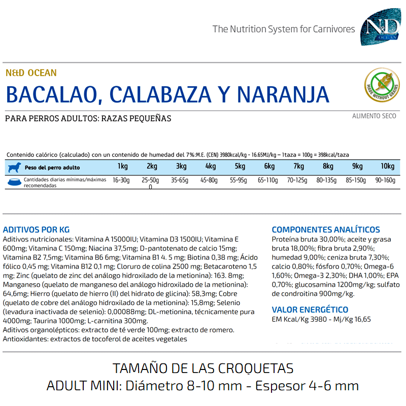 Farmina N&D Ocean Canine pour adultes mini est une alimentation innovante et de qualité exceptionnelle pour petits chiens adultes. Il est élaboré avec des ingrédients délicieux tels que le bacalao, la citrouille et l'orange. Cette combinaison unique de nutriments, de vitamines, de minéraux et d'acides aminés garantit une alimentation complète, saine et équilibrée pour le soin des chiens adultes de petite taille.