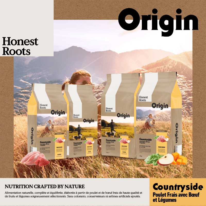 Honest Roots Origin présente Countryside Puppy, des croquettes naturelles pour chiots élaborées avec poulet frais et boeuf comme principales sources de protéines. Sa formule sans céréales, riche en ingrédients naturels, est pensée pour favoriser une croissance saine et le développement optimal des os, des muscles et du système immunitaire des plus jeunes.