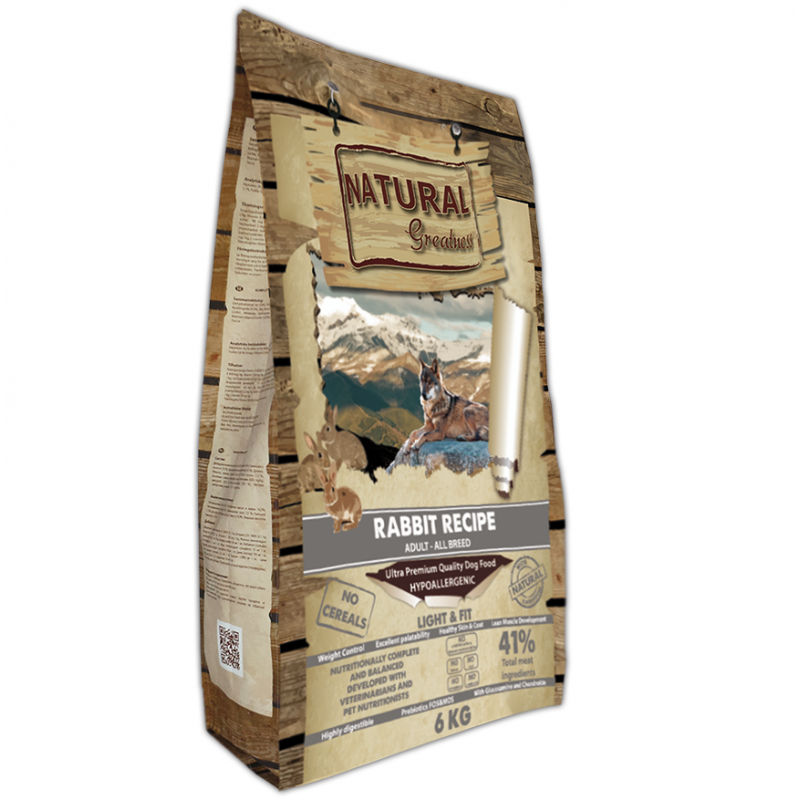 Natural Greatness Chiens présente une recette monoprotéique à base de viande fraîche de lapin, pauvre en matières grasses et hautement digestible. Ces croquettes naturelles pour chiens sont formulées sans céréales et enrichies en fruits, légumes, fibres végétales, chondroprotecteurs et L-Carnitine. Grâce à leur formule hypoallergénique, elles sont idéales pour contrôler le poids, maintenir la vitalité et prendre soin du bien-être digestif de votre compagnon à quatre pattes.