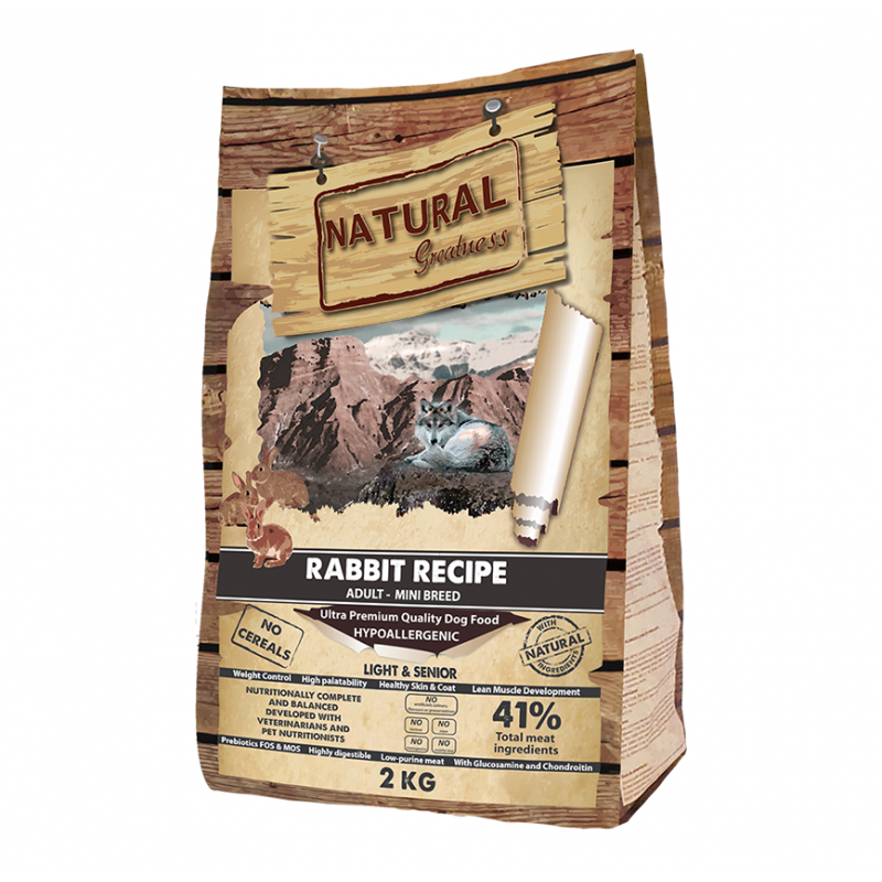 Natural Greatness Chiens Mini Rabbit Recipe sont des croquettes naturelles pour chiens spécialement formulées pour les chiens adultes et senior à digestion sensible ou nécessitant un contrôle du poids. Avec du lapin frais de haute qualité et de la pomme de terre, ces croquettes natural greatness pour chiens apportent tous les nutriments essentiels, favorisent la vitalité et aident à maintenir un pelage sain.