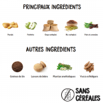 Viandes 40% (viandes déshydratées 30%, poulet frais* 10% avant l'extrusion), blé complet* (12%), graisse de poulet, riz complet* (8%), orge entière* (8%), maïs complet* (8%), pois entiers* (4%), son de blé* (3%), caroube* (2%), pomme* (1%), huile de saumon, graines de lin* (1%), pulpe de betterave, fructo et manano oligosaccharides, levure de bière* (0,5%), plantes aromatiques 0,02% (fenouil*, échinacée*, thym*), yucca schidigera. *INGRÉDIENTS NATURELS