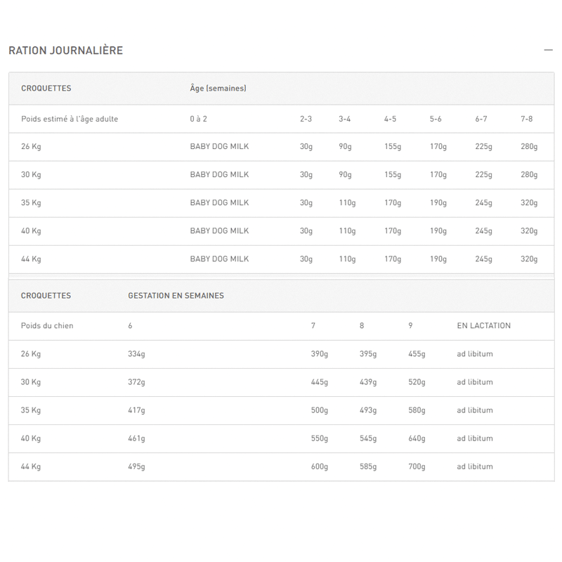 | 26 Kg | 1/2 pour 2-3 mois. 1 pour les autres. | BABY DOG MILK | 6g | 42g | 109g | 124g | 180g | 236g |