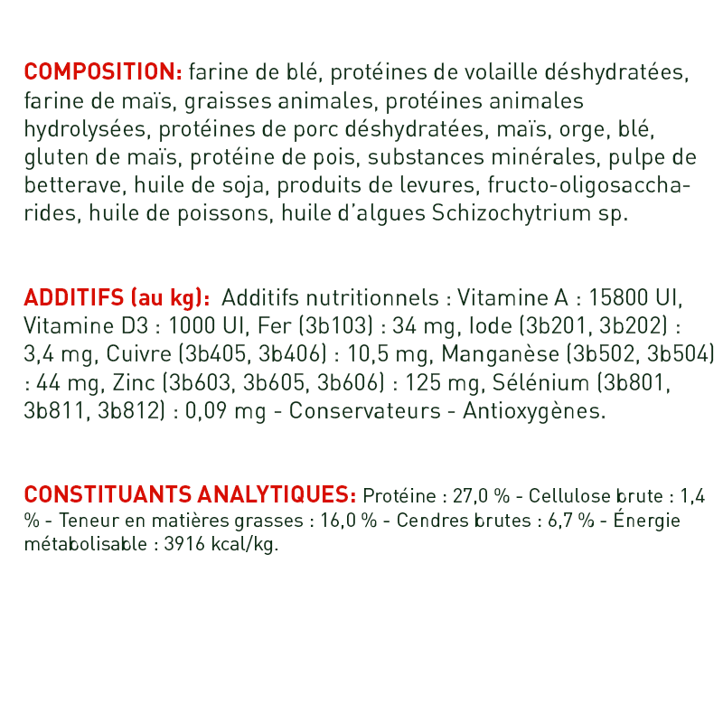 Maintien du poids idéal : Satisfait les besoins énergétiques élevés et favorise la mobilisation des graisses avec de la L-carnitine.