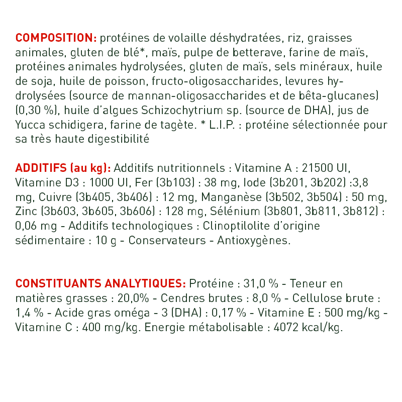 COMPOSITION : protéines de volaille déshydratées, riz, graisses animales, gluten de blé*, maïs, pulpe de betterave, farine de maïs, protéines animales hydrolysées, gluten de maïs, sels minéraux, huile de soja, huile de poisson, fructo-oligosaccharides, levures hydrolysées (source de mannan-oligosaccharides et de bêta-glucanes) (0,30 %), huile d’algues Schizochytrium sp. (source de DHA), jus de Yucca schidigera, farine de tagète. * L.I.P. : protéine sélectionnée pour sa très haute digestibilité