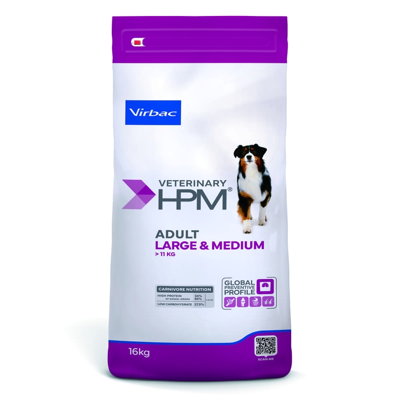 VETERINARY HPM Adult Dog Medium & Large se présente comme une alimentation complète destinée aux chiens de races moyennes (10-25 kg) à partir de 12 mois, et aux chiens de races grandes (>25 kg) à partir de 18 mois.