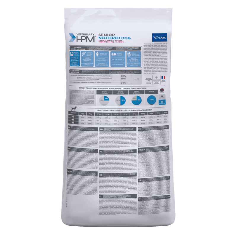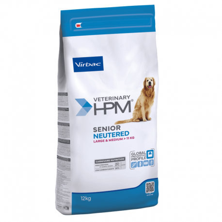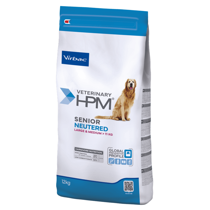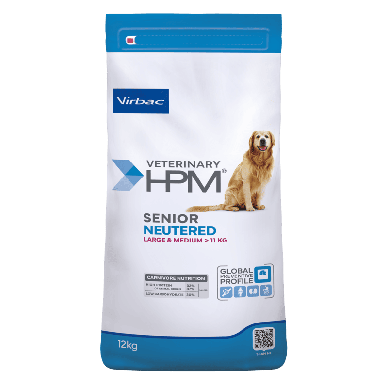 Veterinary HPM Senior Neutered Dog Large & Medium est une alimentation complète spécialement formulée pour les chiens seniors stérilisés ou ayant une tendance à prendre du poids. Conçue pour les grandes races (> 25 kg) à partir de 6 ans et les moyennes races (10-25 kg) à partir de 8 ans.