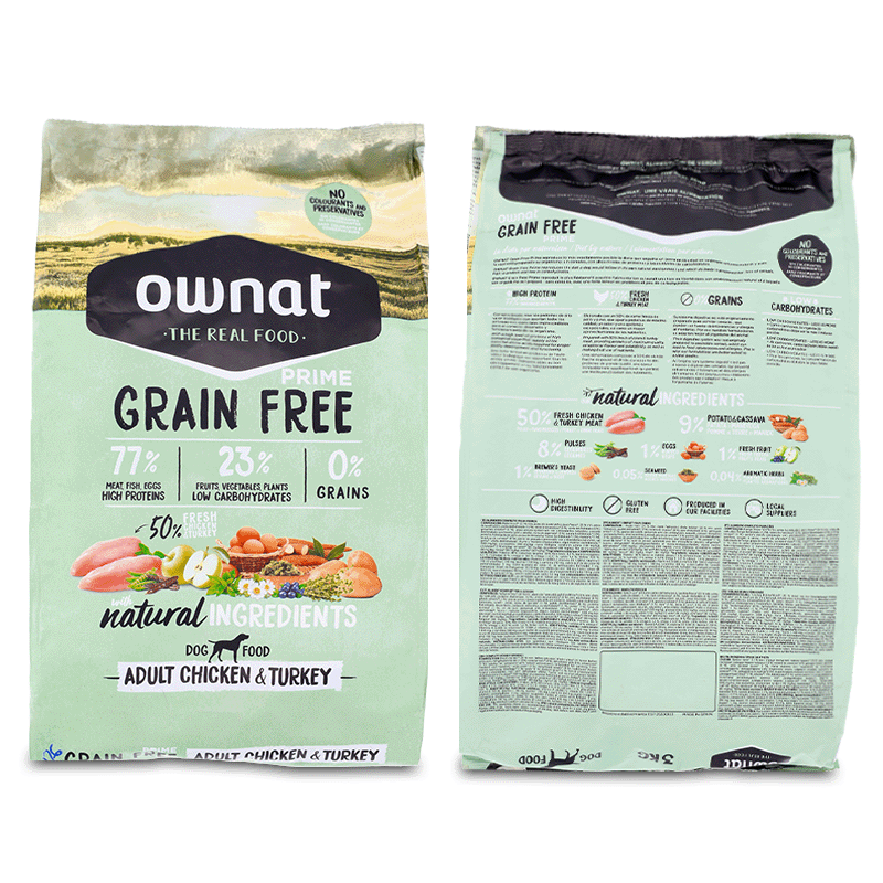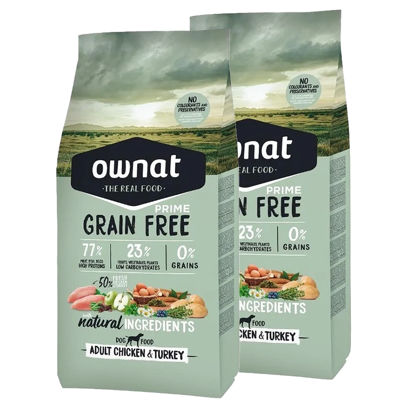 Ownat Grain Free Adult Chicken and Turkey est une alimentation sèche haut de gamme soigneusement conçue pour répondre aux besoins nutritionnels des chiens adultes de toutes races qui maintiennent un niveau d'activité standard.