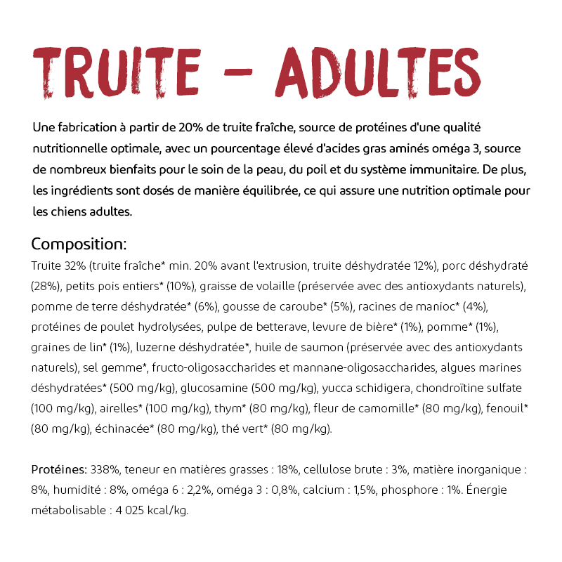 Ces croquettes ont été soigneusement formulées pour les chiens adultes, garantissant une proportion équilibrée d'ingrédients répondant à leurs besoins nutritionnels spécifiques. En plus de la truite fraîche, elles intègrent d'autres ingrédients naturels de haute qualité pour une nutrition complète et satisfaisante.
