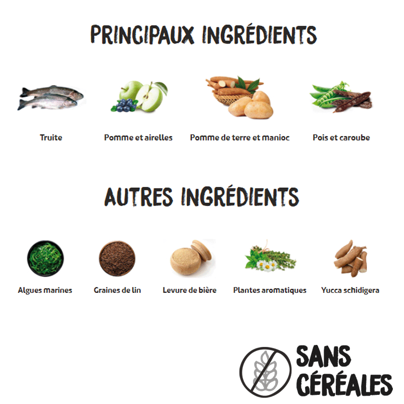 Truite 32% (truite fraîche* min. 20% avant l'extrusion, truite déshydratée 12%), viande déshydratée (28%), petits pois entiers*, graisse de volaille (préservée avec des antioxydants naturels), pomme de terre déshydratée*, gousse de caroube*, racines de manioc*, protéines de poulet hydrolysées, pulpe de betterave, levure de bière*, pomme fraîche* (1%), graines de lin*, luzerne déshydratée*, huile de poisson (préservée avec des antioxydants naturels), sel gemme*, fructo-oligosaccharides et mannane-oligosaccharides, algues marines déshydratées*, glucosamine, chondroïtine, yucca schidigera, airelles*, thym*, fleur de camomille*, fenouil*, échinacées*, thé vert*. *Ingrédients naturels