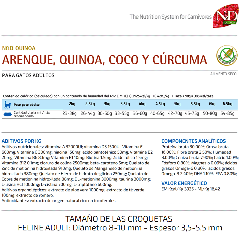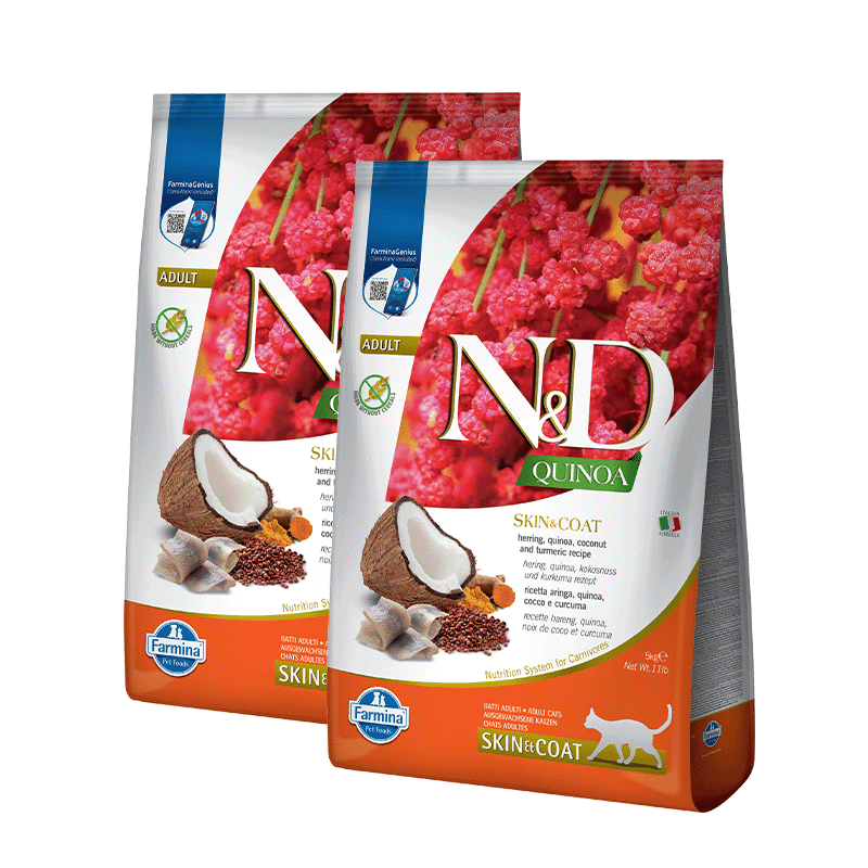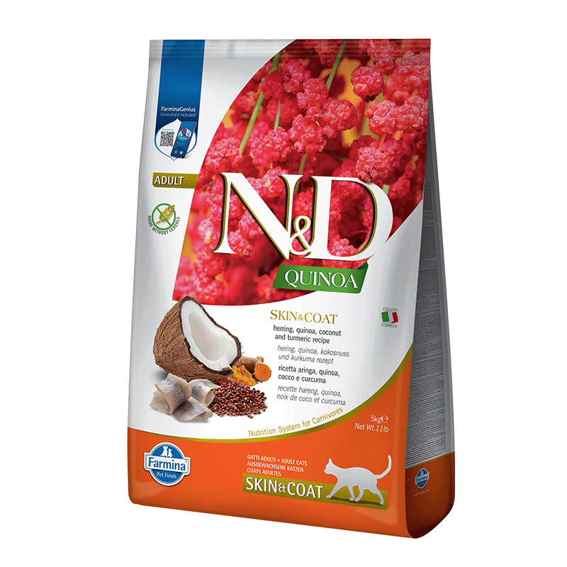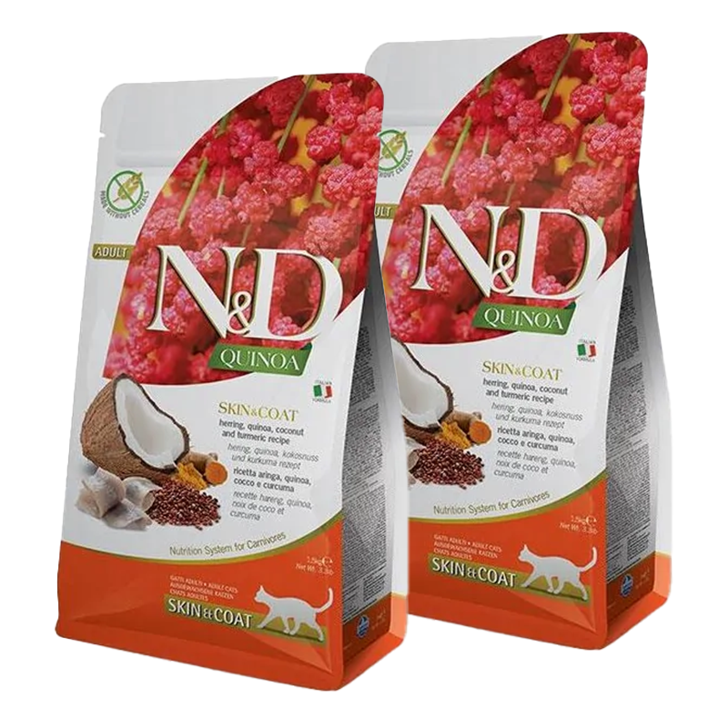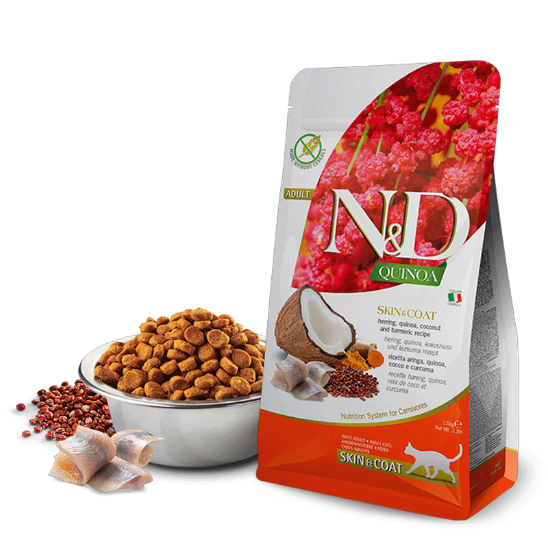 N&D Quinoa Feline - Skin & Coat Hareng Adulte de Farmina Pet Foods est une alimentation idéale pour les chats adultes dont la peau est sujette à la sensibilité. Cette nourriture unique est conçue pour améliorer la santé et le bien-être des chats, soutenant la prévention des maladies et renforçant le système immunitaire en même temps. Cette nourriture contient des ingrédients naturels et biologiques tels que la quinoa, un complexe nutritif riche en fibres et protéines de haute valeur biologique, travaillant pour fournir des nutriments et prévenir les maladies, les allergies et les infections.