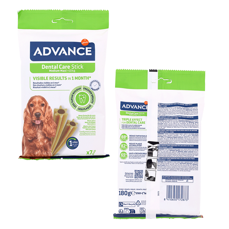 Étude Scientifique : Les avantages ne sont pas simplement des affirmations, mais ils sont étayés par une étude scientifique*. En ce qui concerne une haleine plus fraîche, on observe une quantité moindre de composés volatils de sulfure par rapport aux chiens qui n'ont pas consommé Advance Dog Dental Care Stick.