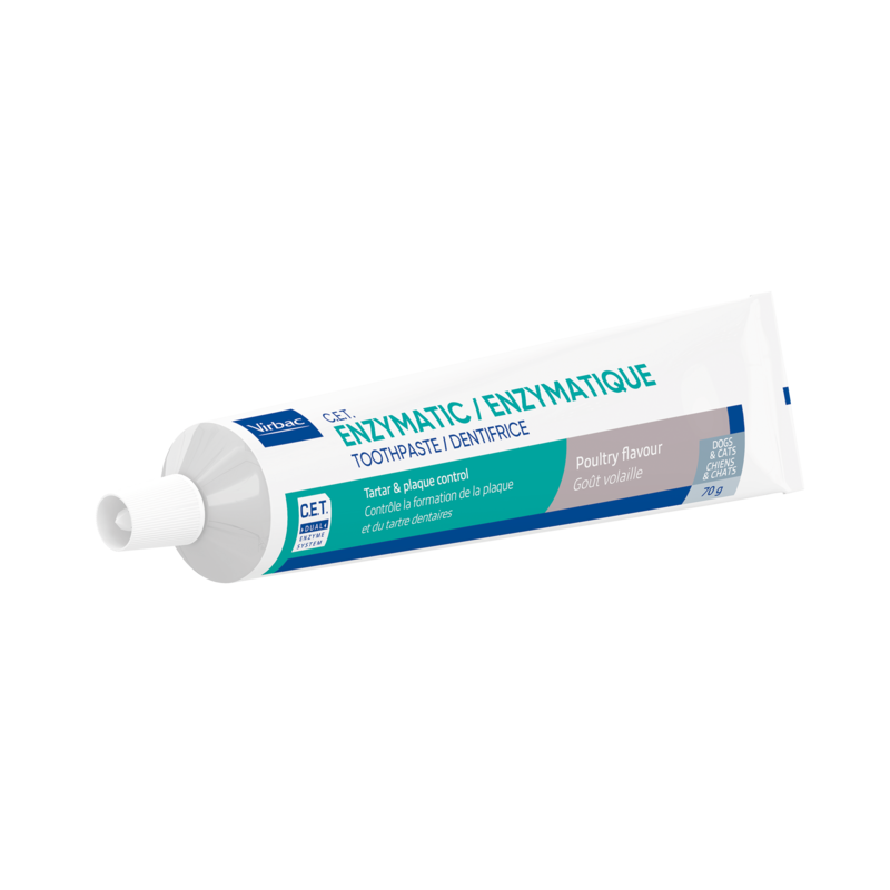 La pâte dentifrice enzymatique Virbac au poulet combat la plaque dentaire et aide à éliminer le tartre. Adaptée à une utilisation quotidienne, elle renforce et reminéralise l'émail tout en contribuant au soulagement de la douleur des gencives. L'action des enzymes de cette pâte dentifrice aide à prévenir l'apparition de bactéries, évitant ainsi la formation de tartre et la mauvaise haleine.
