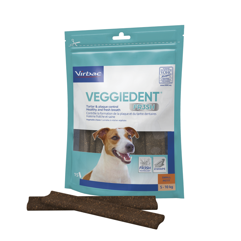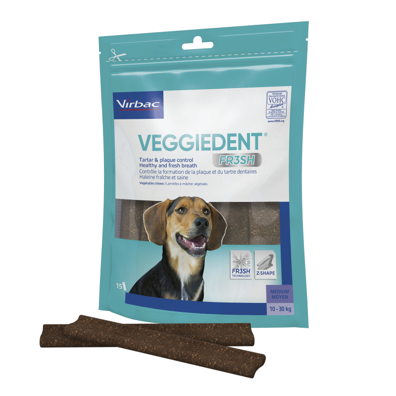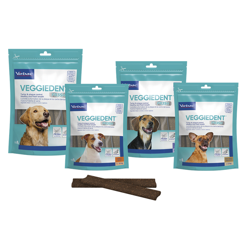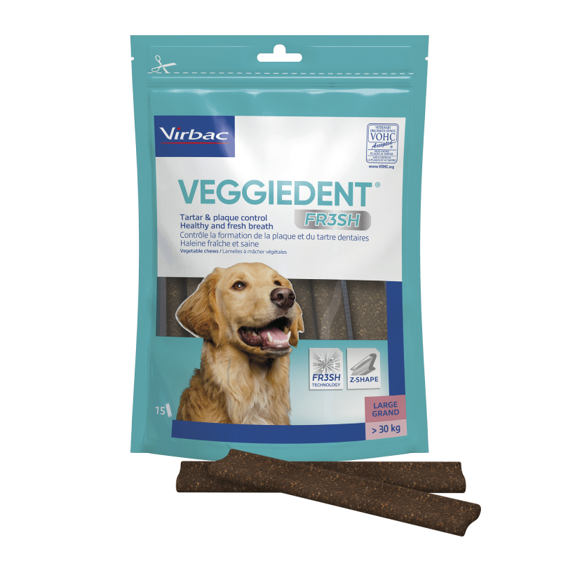Les lamelles à mâcher VEGGIEDENT FR3SH aident à prévenir la mauvaise haleine en évitant qu'elle ne s'interpose entre votre chien et vous. Diverses études ont démontré une nette amélioration de la fraîcheur de la respiration, perçue par 90% des propriétaires, et 87% recommanderaient le produit. De plus, la grande qualité du produit, l'odeur agréable, sa composition naturelle et saine, et la gamme de tailles adaptables à chaque chien en font le produit parfait pour l'hygiène buccale quotidienne de votre animal.