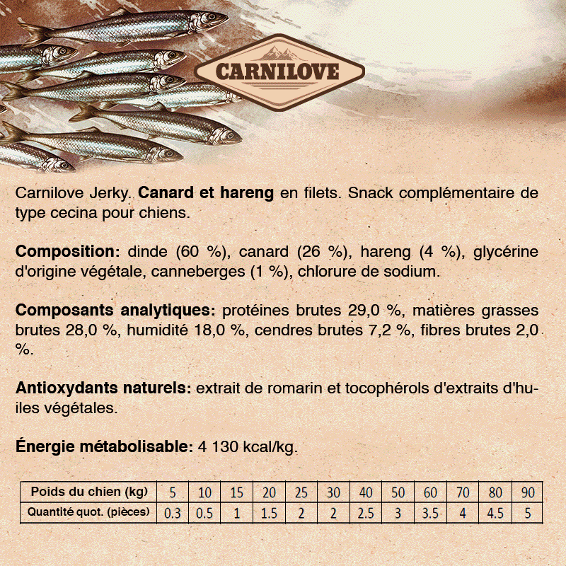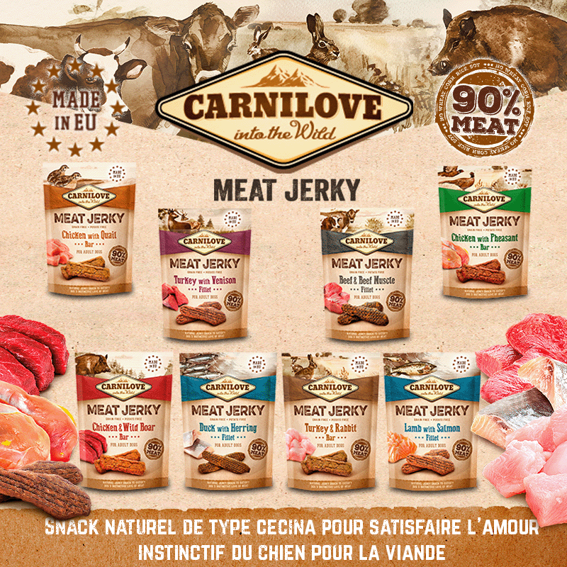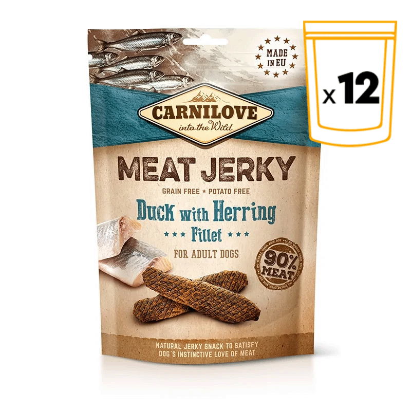 Carnilove Meat Jerky Duck With Herring Fillet, une alimentation hyperprotéinée développée pour que les chiens de toutes les étapes de la vie puissent profiter d'une saveur unique, 100% naturelle et traditionnelle. Ce mélange riche contient 91% de viande et de poisson de première qualité, la patte de canard étant la principale source de protéines. Les ingrédients tendres ont été lentement marinés dans des conditions idéales sans l'utilisation de conservateurs artificiels. Il est sans gluten, lactose et céréales. Carnilove Meat Jerky Duck With Herring Fillet est une excellente source des nutriments essentiels nécessaires au bon développement et à la santé de nos félins et canins.