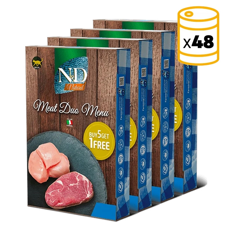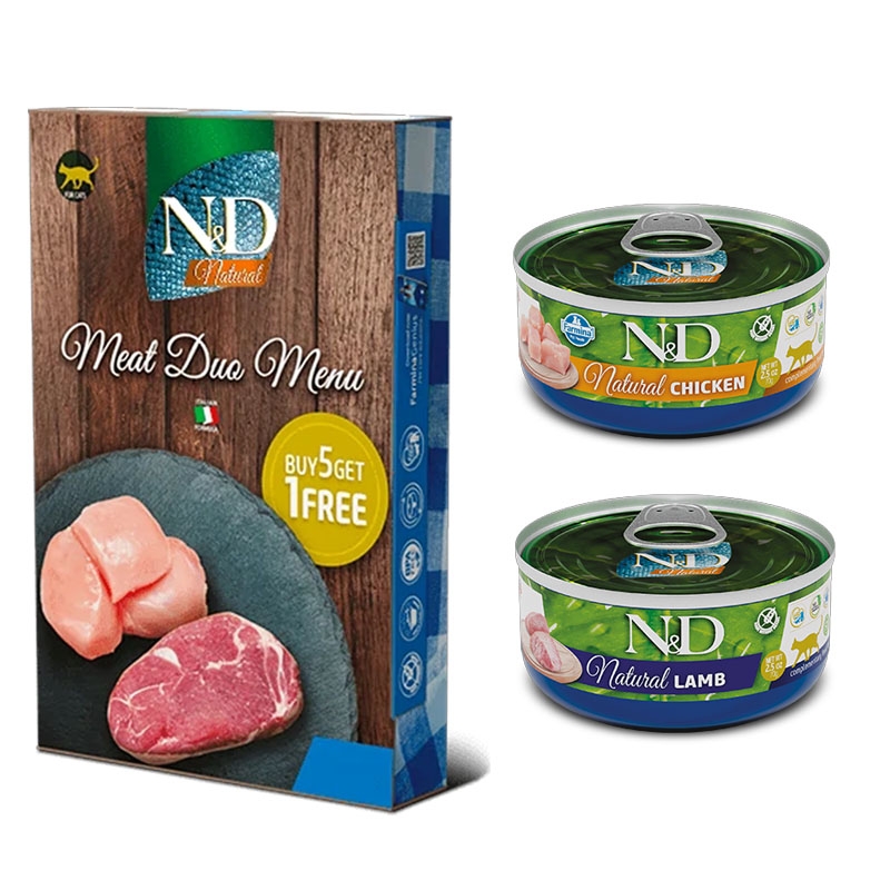Le Meat Duo Menu de N&D Natural est un pack de deux boîtes différentes offrant une combinaison irrésistible de poulet et d'agneau. Conçu comme un aliment complémentaire pour les chats adultes, ce pack fournit une option délicieuse et équilibrée pour enrichir le régime alimentaire quotidien de votre félin.