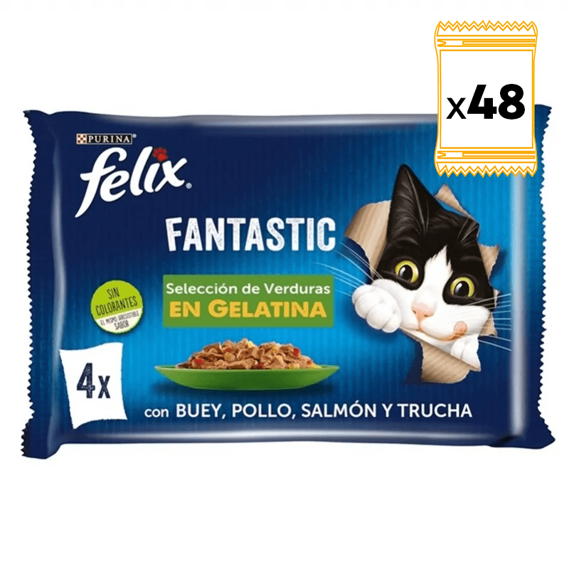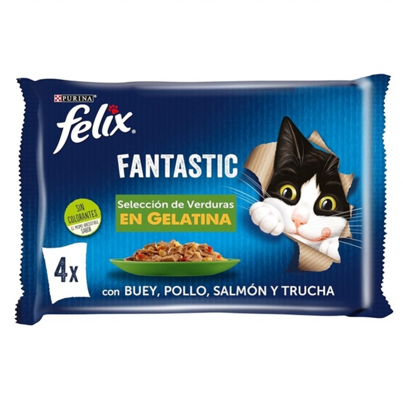 Variété de Recettes : Felix Fantastic Sélection de Légumes comprend quatre saveurs distinctes : viande de bœuf avec carottes, poulet avec tomates, truite avec haricots verts et saumon avec courgettes. Cette diversité garantit que votre chat bénéficie d'une alimentation variée et ne s'ennuie jamais, lui offrant une expérience nouvelle et excitante à chaque repas.