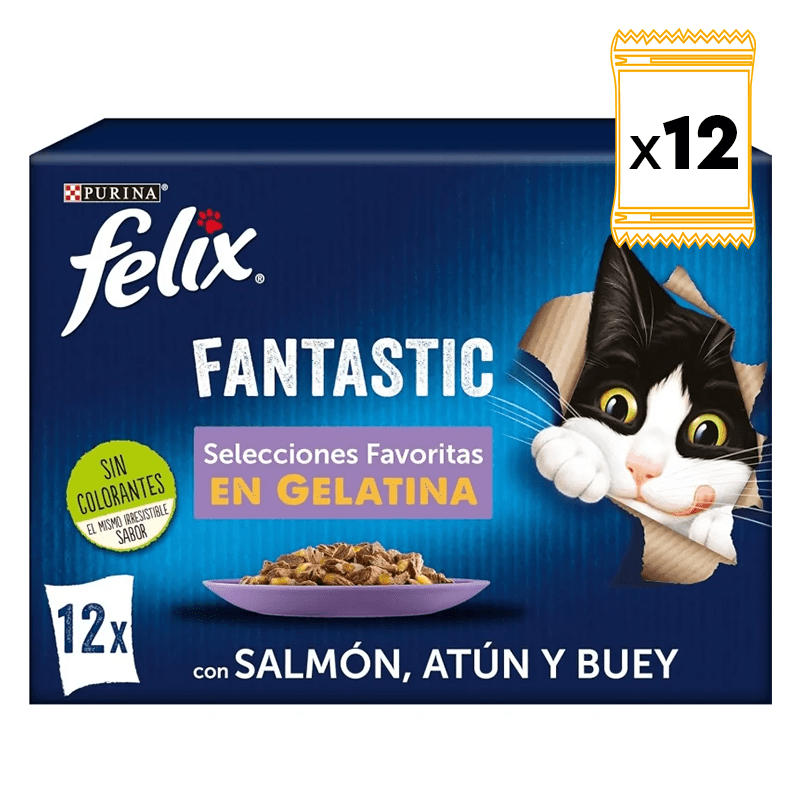 Variété de Recettes : Felix Fantastic Sélections Préférées présente quatre saveurs distinctes : boeuf, poulet, saumon et thon. Cette diversité assure que votre chat ait toujours quelque chose de nouveau et d'excitant à déguster à chaque repas, maintenant son intérêt et le délectant à chaque bouchée.