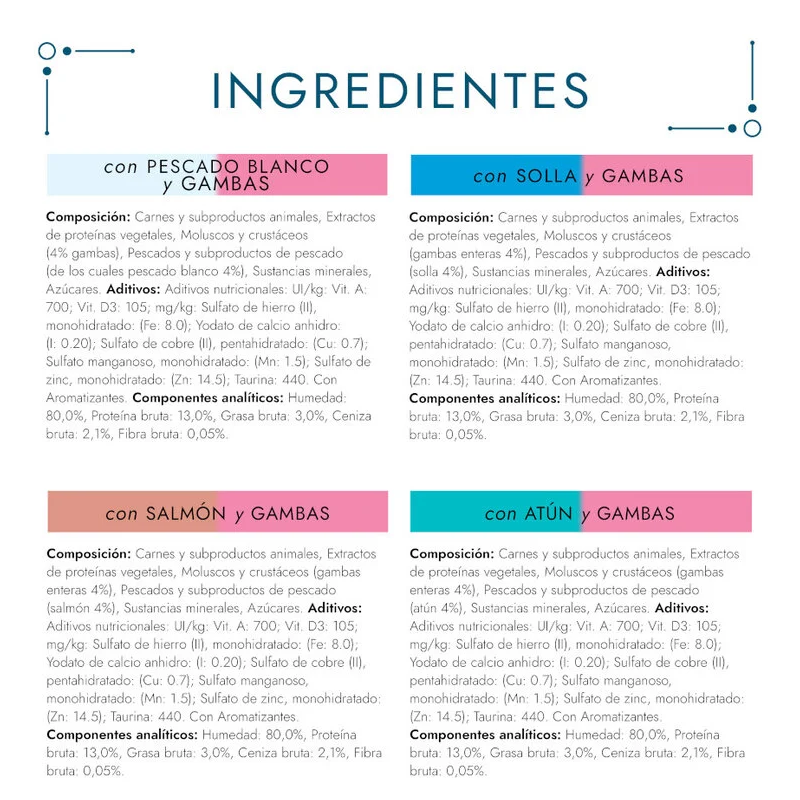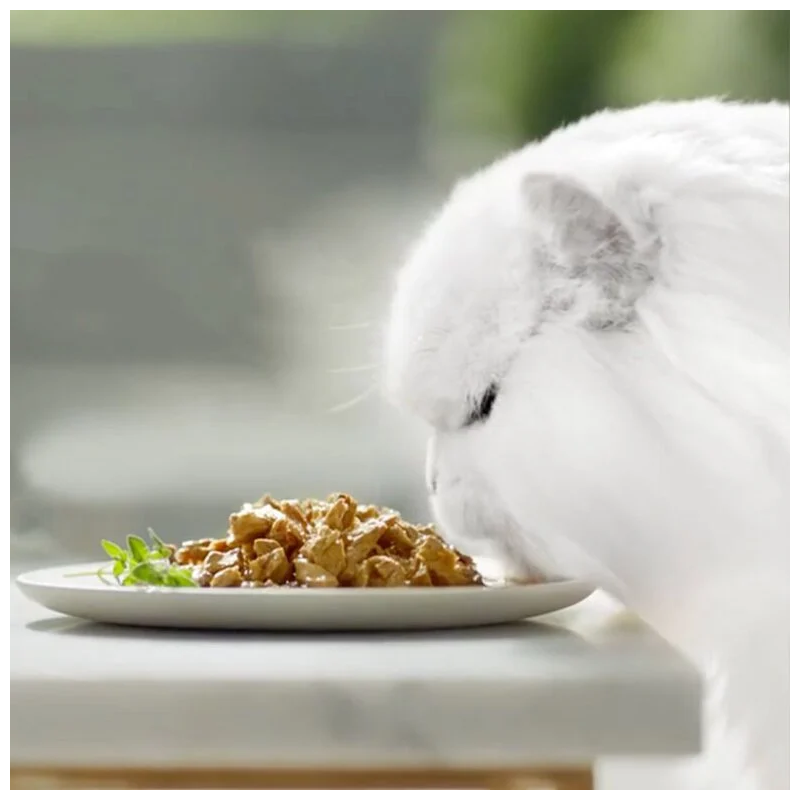 Ces délices de poisson sont préparés avec de fins morceaux de différents poissons, cuisinés dans une sauce savoureuse qui rehausse le goût de la mer. Les combinaisons incluent du poisson de l'océan avec des crevettes, du poisson blanc avec des crevettes, du saumon avec des crevettes et du thon avec des crevettes, garantissant que votre chat se régale à chaque bouchée.