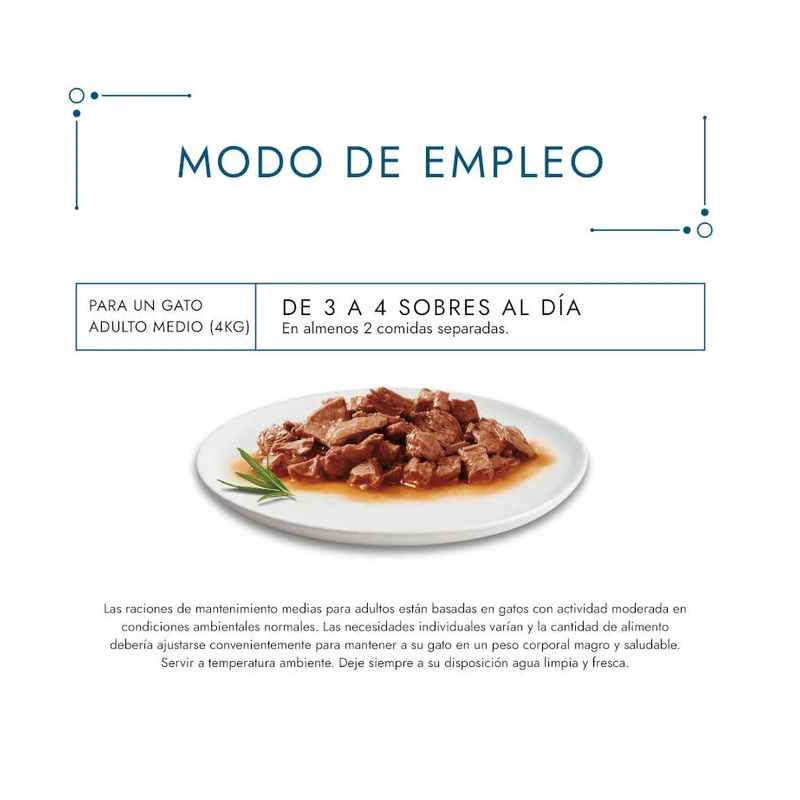 Ces sachets de nourriture humide sont idéaux comme aliment complémentaire quotidien ou comme récompense occasionnelle. Chaque portion est préparée pour garantir fraîcheur et éviter la perte de propriétés une fois le sachet ouvert. Les morceaux de viande, cuits dans une riche sauce, ont un goût irrésistible et très juteux, parfaits pour satisfaire le palais raffiné de votre animal.