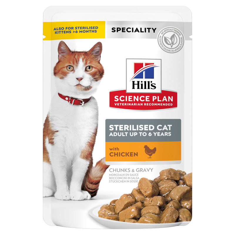 Hill's Science Plan Sterilised Cat est un aliment complet conçu pour les chats stérilisés âgés de 6 mois à 6 ans.