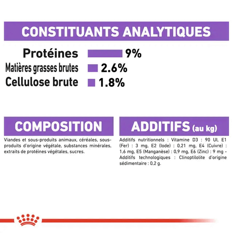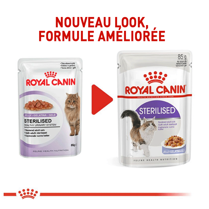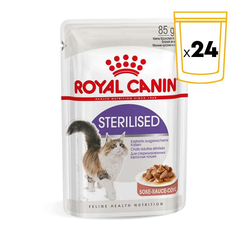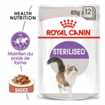Royal Canin Sterilised est un aliment humide presenté en fines tranches en sauce pour les chats adultes stérilisés (à partir d'un an). Favorise la santé du tractus urinaire et contribuie à maintenir le poids idéal de votre félin.