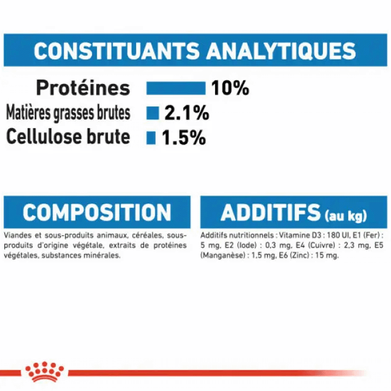 Constituants analytiques : Protéine brute : 11 % - Matières grasses brutes : 2 % - Cendres brutes : 1,4 % - Fibres brutes : 1,2 % - Humidité : 82,5 % - L-carnitine : 35 mg/kg.