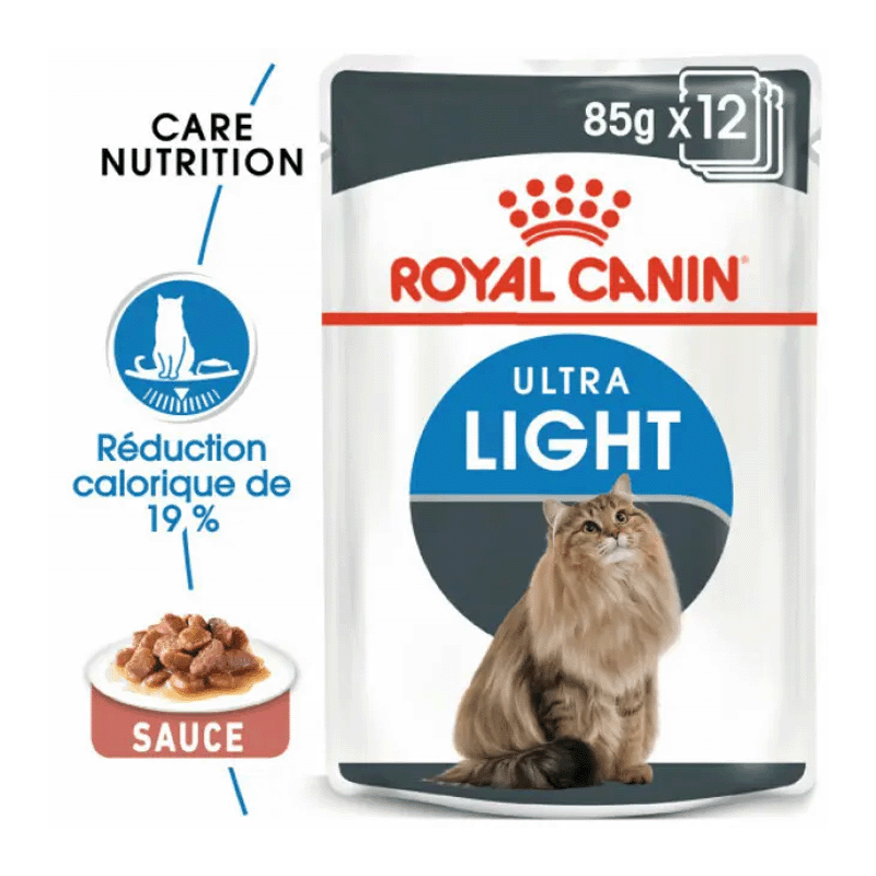 Royal Canin Ultra Light est une nourriture humide pour les chats adultes (à partir de 12 mois) ayant tendance à être en surpoids. Il s'agit d'un aliment avec beaucoup moins de calories que la nourriture normale.