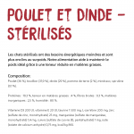 Composition : Poulet (36 %), bouillon (31,9 %), dinde (29 %), pommes de terre (2 %), minéraux, spiruline (0,1 %).
